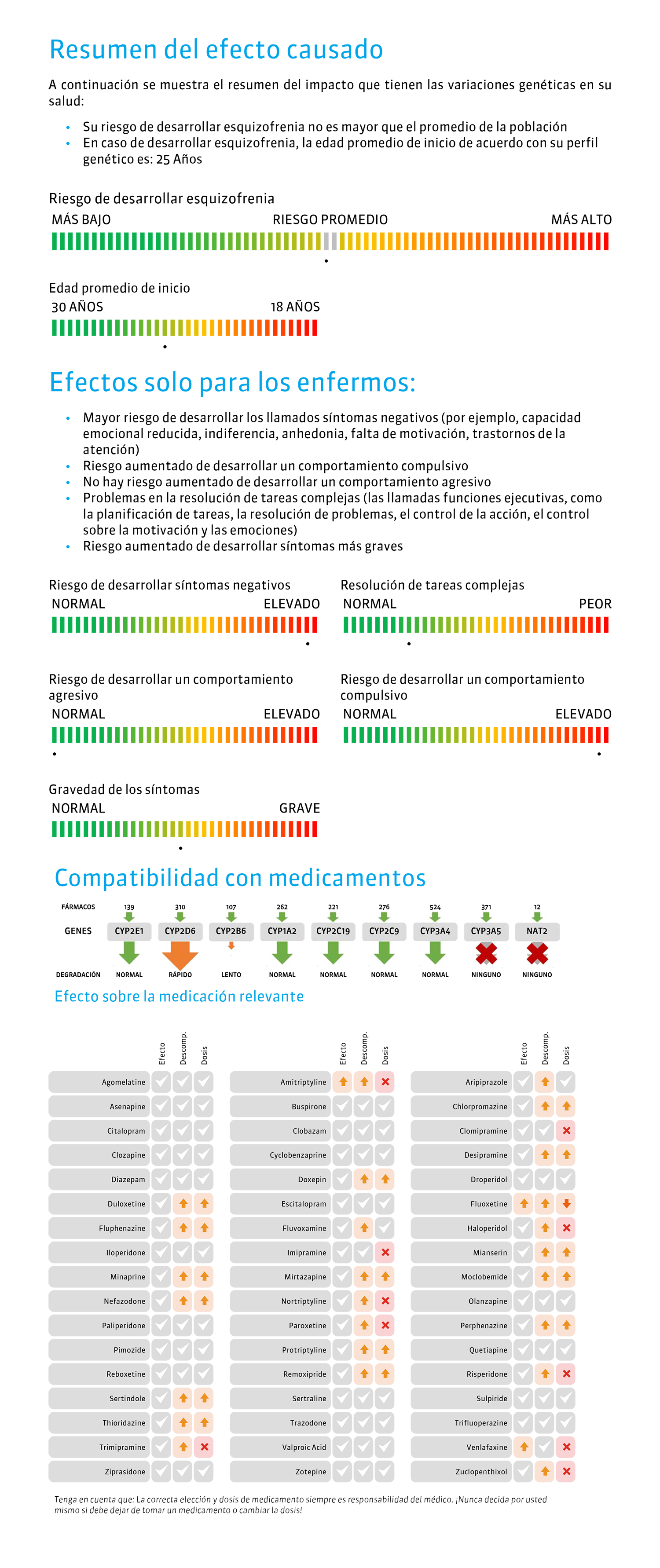 Después del análisis exitoso, resumimos los resultados de nuestra prueba en una evaluación escrita detallada. Entre otras cosas, explicamos en detalle la probabilidad de desarrollar varios síntomas de esquizofrenia.